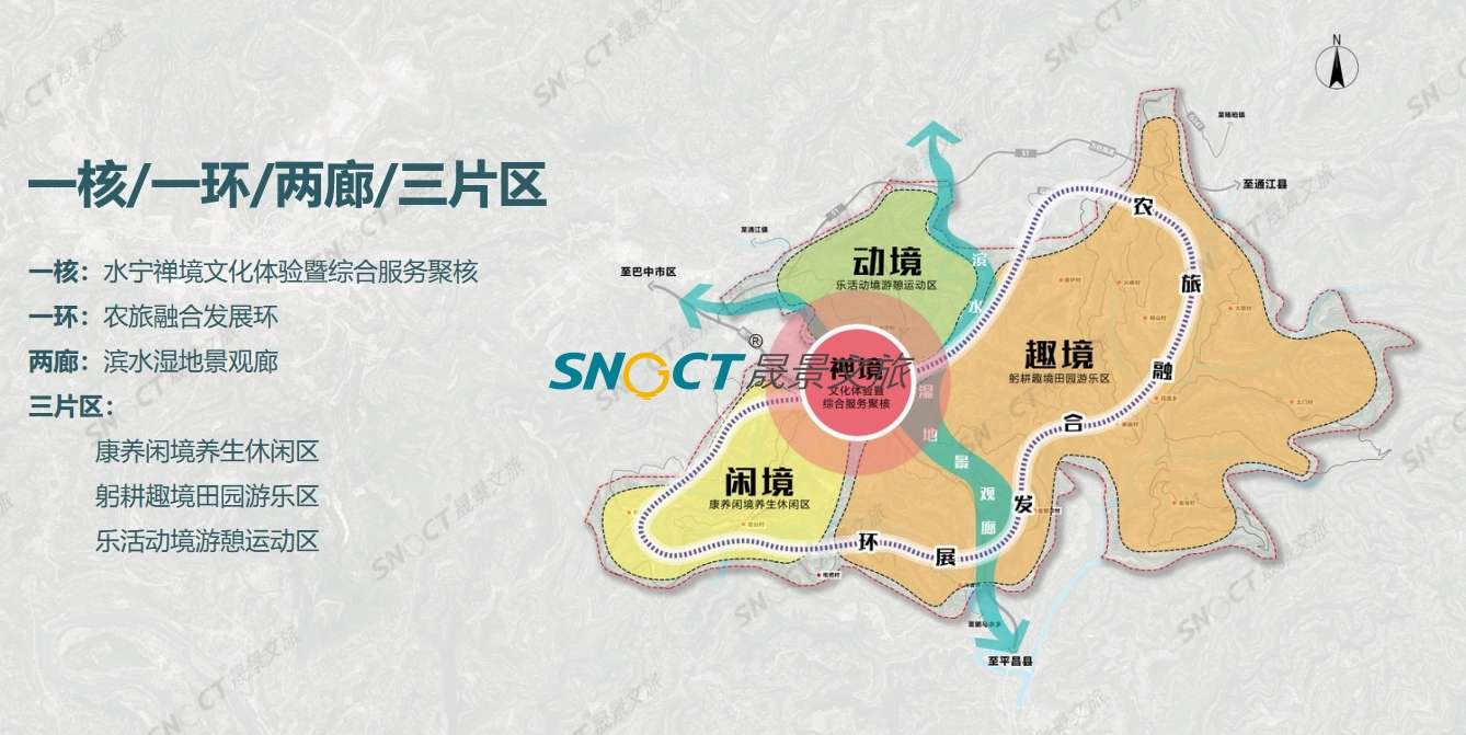通過(guò)塑立水寧文化IP,回歸禪境藥鄉(xiāng)時(shí)光,完善配套服務(wù)設(shè)施等三大理念策略,助水寧寺突破現(xiàn)狀旅游困局。以“禪”為靈魂,以“養(yǎng)”為特色,以生態(tài)為載體,充分利用全域資源,經(jīng)營(yíng)生態(tài)、經(jīng)營(yíng)環(huán)境、經(jīng)營(yíng)鄉(xiāng)村、經(jīng)營(yíng)文化,通過(guò)“一核、一環(huán)、兩廊、三片區(qū)”空間結(jié)構(gòu)重塑,8大重點(diǎn)項(xiàng)目+6大配套項(xiàng)目的功能分區(qū)布局,“+旅游”,布局“2+2”產(chǎn)業(yè)融合發(fā)展模式,形成全鏈?zhǔn)桨l(fā)展,以實(shí)現(xiàn)將水寧寺鎮(zhèn)打造成禪養(yǎng)微度假目的地。