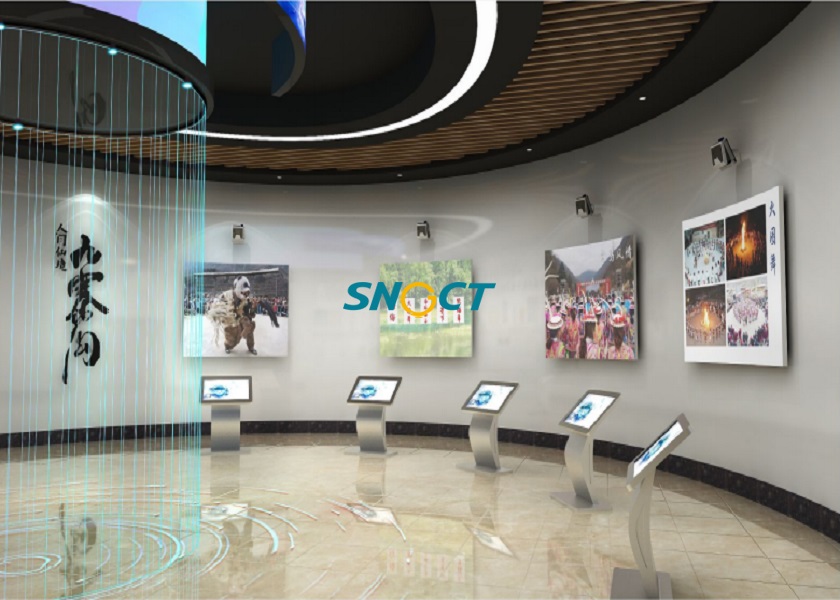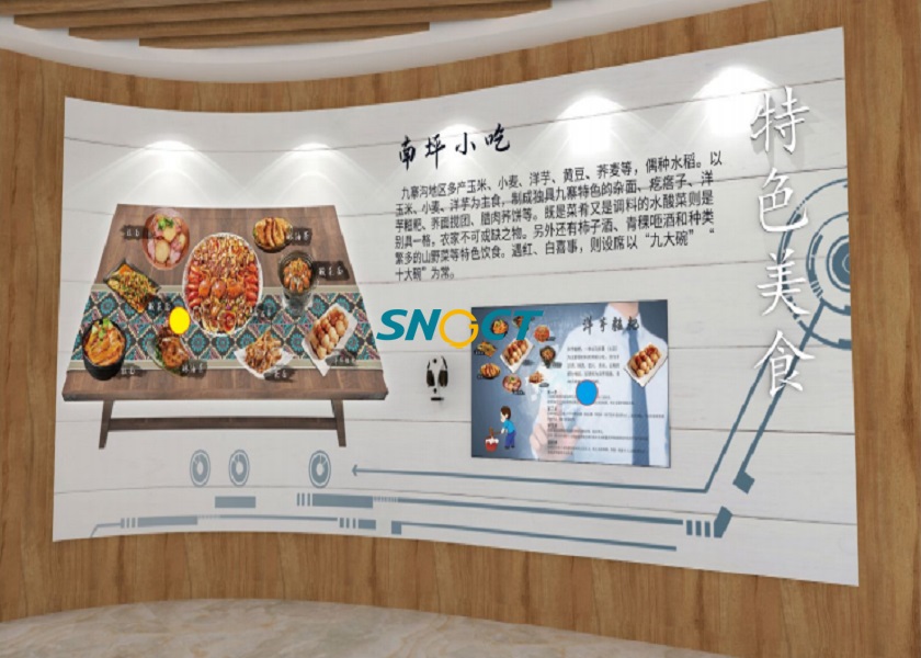 本次項(xiàng)目規(guī)劃設(shè)計(jì)的內(nèi)容有:二層數(shù)字廳,修復(fù)現(xiàn)場(chǎng)已有投影設(shè)備,聯(lián)動(dòng)成一組全新旅游圖,分篇章講述不同文化;美食區(qū)配備一臺(tái)內(nèi)鑲式觸摸屏,內(nèi)置可操控程序呈現(xiàn)九寨不同菜品的故事背景及制作工序,配有耳機(jī)給人以沉浸式體驗(yàn)。左側(cè)為實(shí)時(shí)投影由觸摸屏控制,呈現(xiàn)出九寨特色菜品美食從而使參觀者直觀感受。一層規(guī)劃建設(shè)廳、援建廳以及中庭。